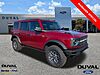 This 2025 Ford Bronco Badlands in Ruby Red Metallic Tinted Clearcoat, features Equipment Group 334A Lux Package (2-Door Intelligent Access w/Lock/Unlock, 360-Degree Camera, Adaptive Cruise Control, Ambient Footwell Lighting, Connected Navigation, Dr & Pass Illuminated Sliding Visor Vanity Mirrors, Dual Smart Charging USB Ports, Dual-Zone Electronic Automatic Temperature Control, Evasive Steering Assist, Front Parking Sensors, Front Row Heated Seats, Information on Demand Panel, Power Outlet - Back Side of Center Floor Console, Radio: B&O Sound System by Bang & Olufsen, Rear Parking Sensors, Sideview Mirrors, and Universal Garage Door Opener), 4-Wheel Disc Brakes, 4.7 Axle Ratio, 7 Speakers, ABS brakes, Air Conditioning, Alloy wheels, AM/FM radio: SiriusXM with 360L, AM/FM Stereo, Auto High-Beam Headlamps, Auto High-beam Headlights, Auto-dimming Rear-View mirror, BLIS Blind Spot Information System, Body Color-Painted Hard Top, Brake assist, Compass, Delay-off headlights, Door Storage Bags, Driver door bin, Driver vanity mirror, Dual front impact airbags, Dual front side impact airbags, Electronic Stability Control, Emergency communication system: 911 Assist, Exterior Parking Camera Rear, Ford Performance Heavy-Duty Modular Front Bumper, Front anti-roll bar, Front Bucket Seats, Front Center Armrest, Front fog lights, Front reading lights, Front wheel independent suspension, Fully automatic headlights, Hard Top Sound Deadening Headliner, Heated door mirrors, Heated front seats, Heated steering wheel, Illuminated entry, Integrated roll-over protection, Lane-Keeping System, Leather Shift Knob, Low tire pressure warning, Marine Grade Vinyl Heated Bucket Seats, Occupant sensing airbag, Outside temperature display, Overhead airbag, Overhead console, Panic alarm, Passenger door bin, Passenger vanity mirror, Power door mirrors, Power steering, Power windows, Pre-Collision Assist w/Automatic Emergency Braking, Radio data system, Rear-View Camera, Rear-Window Defroster & Washer